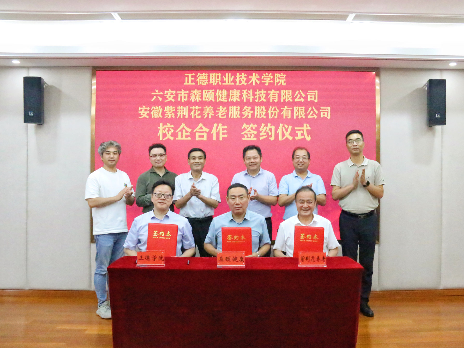 为扩大智慧健康养老专业影响力,吸引更多省外优质生源报考,6月17日下午,天博体育 与六安市森颐健康科技有限公司(简称森颐健康)、安徽紫荆花养老服务股份有限公司(简称紫荆花)举行了合作签约仪式。安徽紫荆花养老董事长田淮民、六安市森颐健康董事长徐以军、总经理高卫,天博体育 院长孙永荣、副院长赵凯雷、院长助理兼党政办公室主任王伟、院长助理兼招生就业处处长王墀及相关部门负责人参加,六安市裕安区老教委副主任叶庆和应邀参加签约仪式。