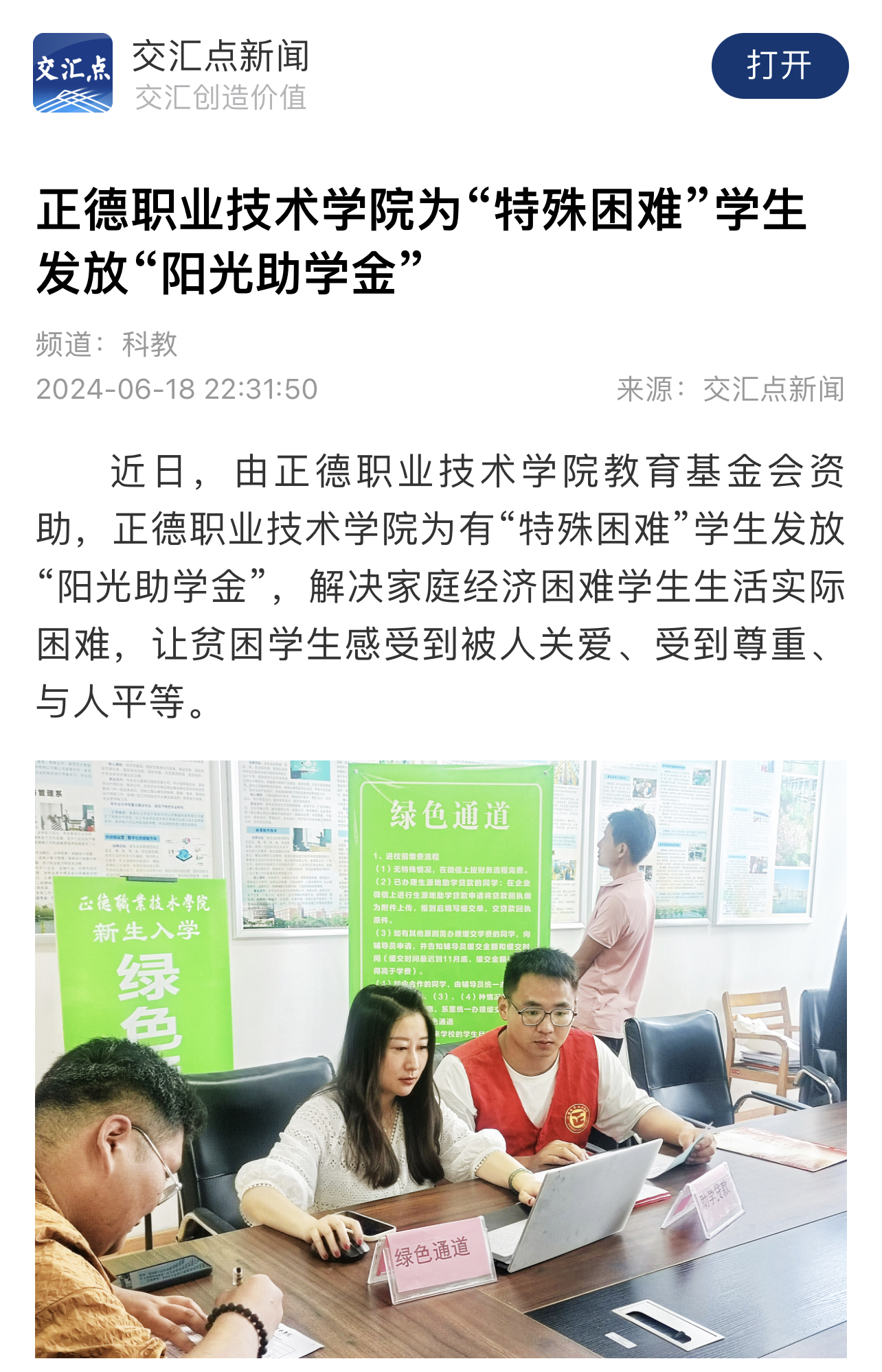 【交汇点新闻】正德职业技术天博体育 为“特殊困难”学生发放“阳光助学金”