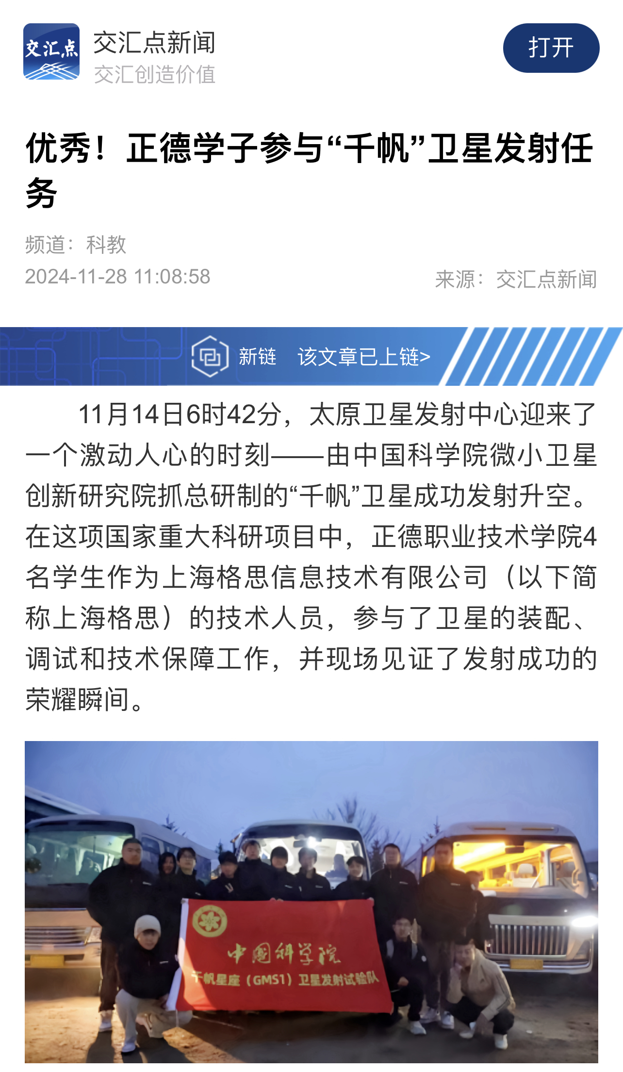 【交汇点新闻】优秀!正德学子参与“千帆”卫星发射任务