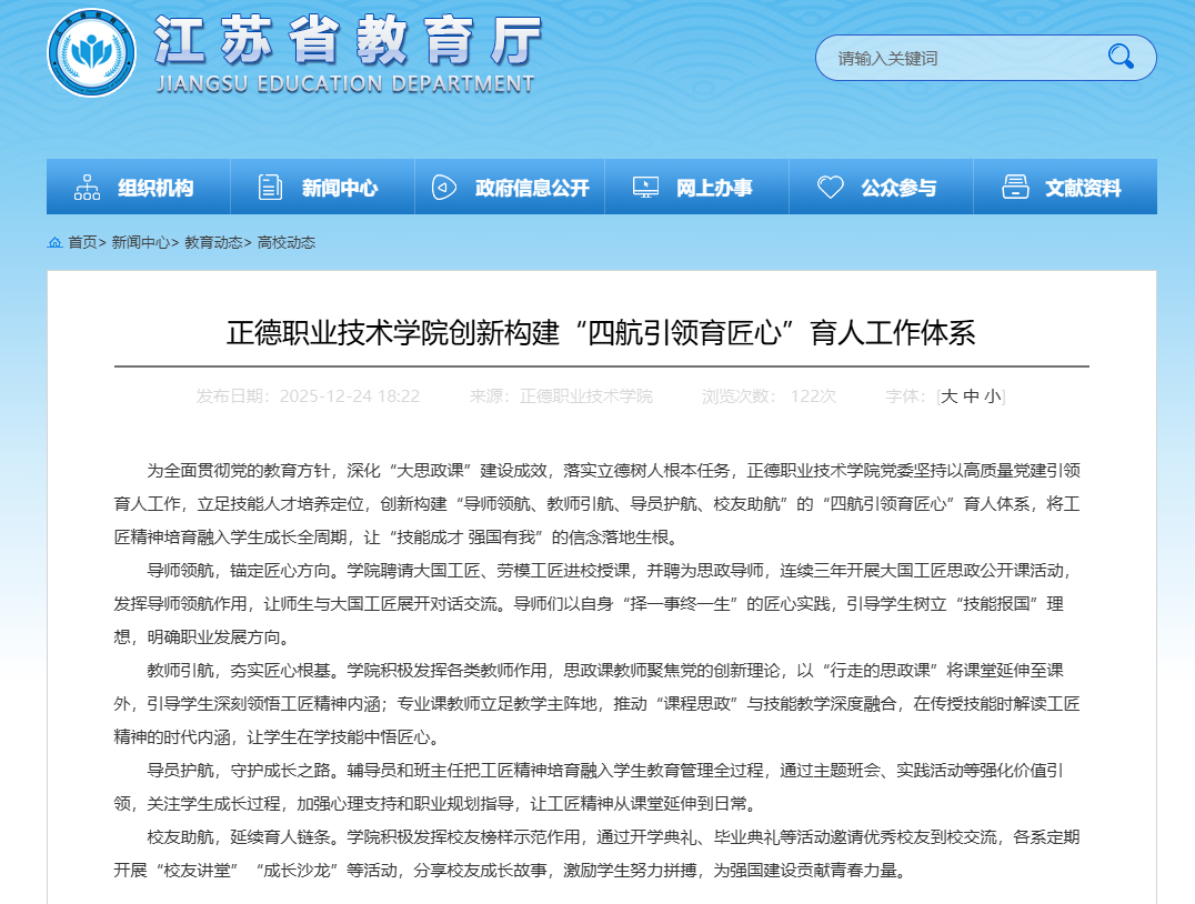 【江苏省教育厅】正德职业技术天博体育 创新构建“四航引领育匠心”育人工作体系